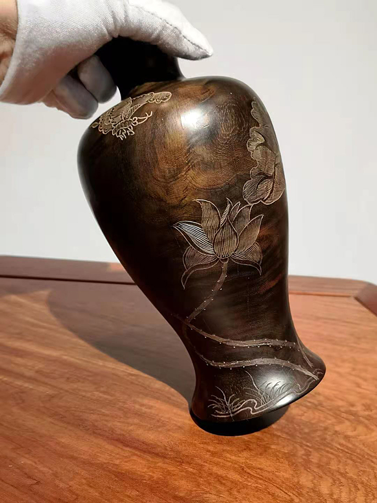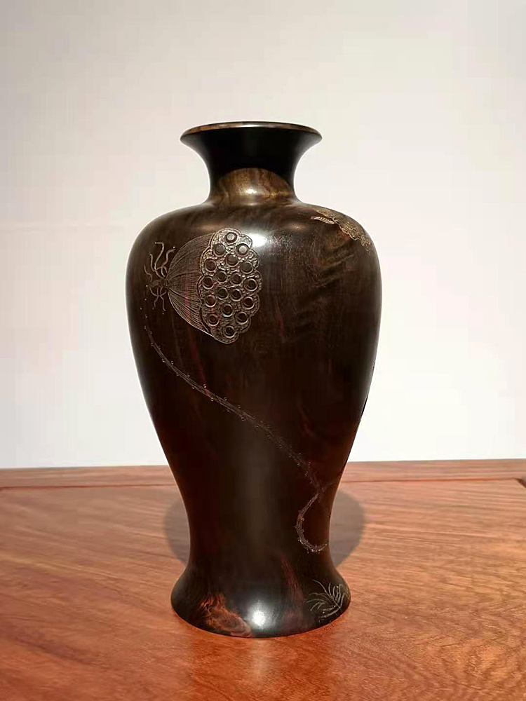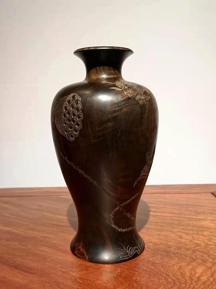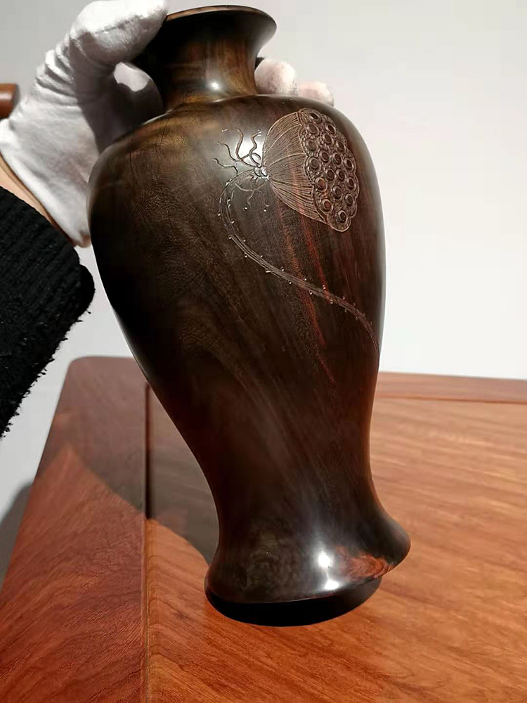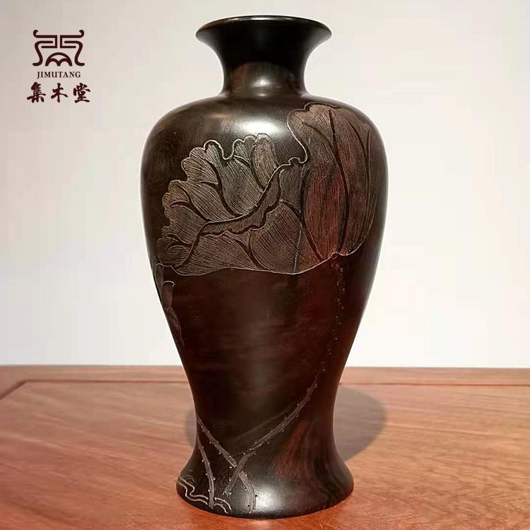 老挝大红酸枝花瓶 集木堂精品红木花瓶 影雕荷花插花瓶