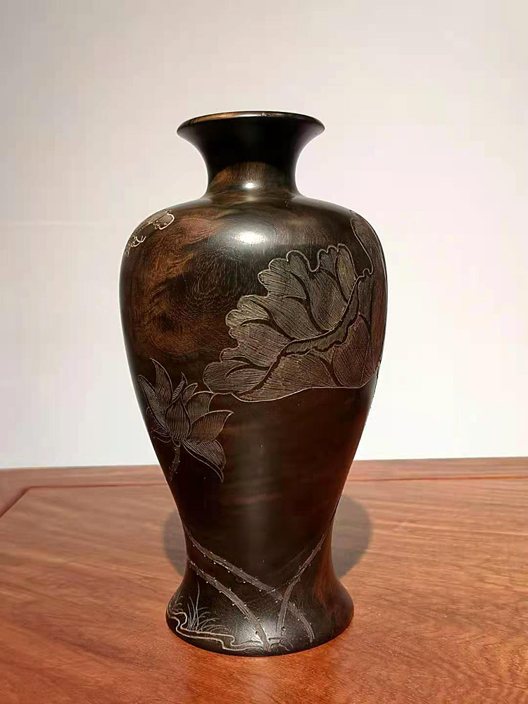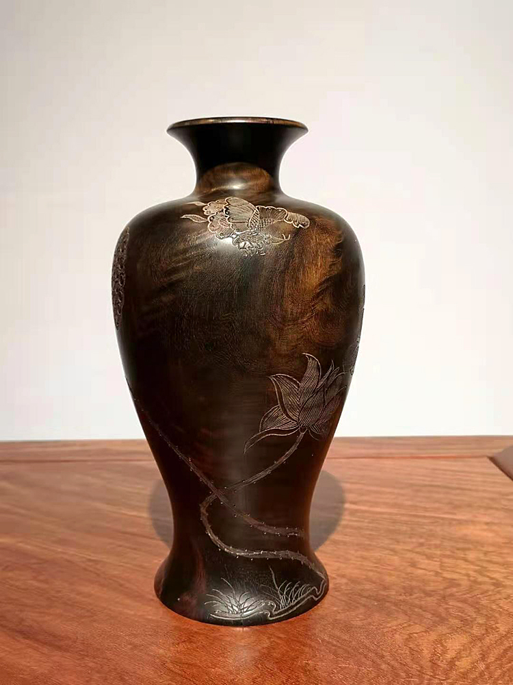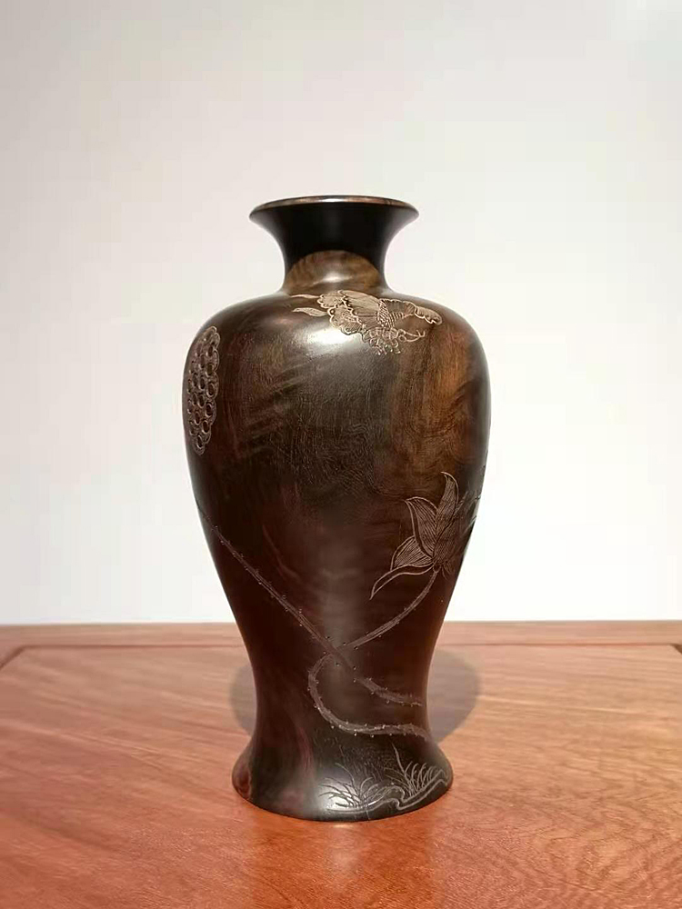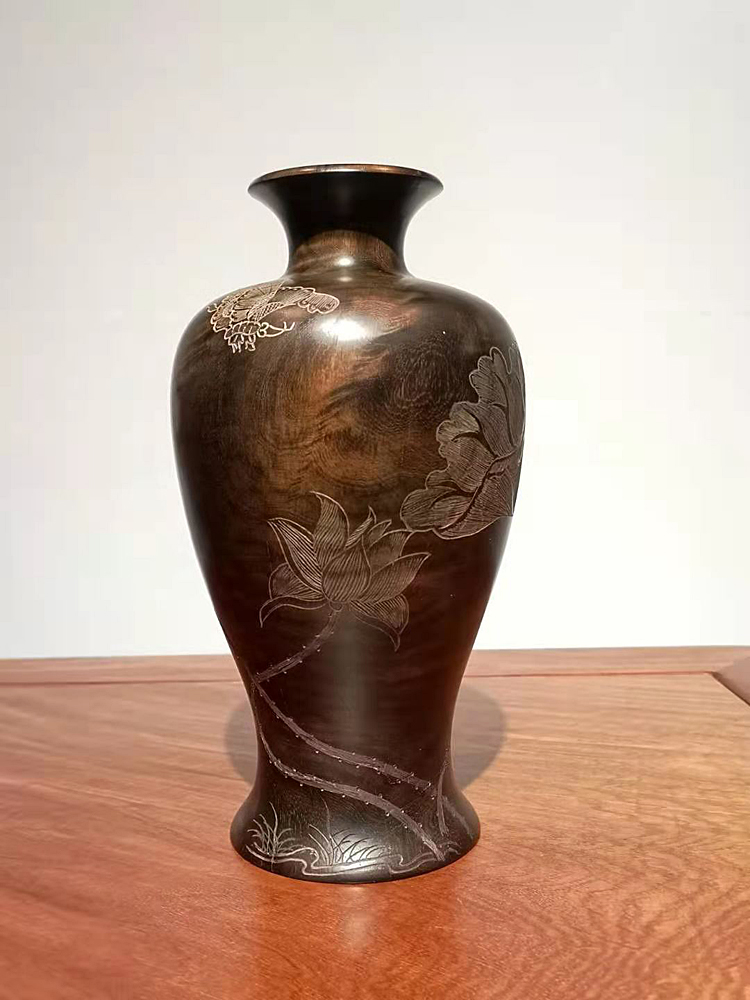 老挝大红酸枝花瓶 集木堂精品红木花瓶 影雕荷花插花瓶