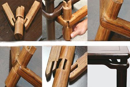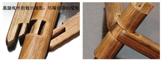 裹腿枨结构常用于圆腿红木家具上,偶尔也用在方腿红木家具上。裹腿枨表面高出腿部,两枨在腿部转角处相交,将腿部包起来。腿与两枨相交处削圆成方,以便嵌纳椅子。枨子端头外皮切成45度角,与相邻的枨格角相交,囊皮留榫,放入腿部的榫眼。