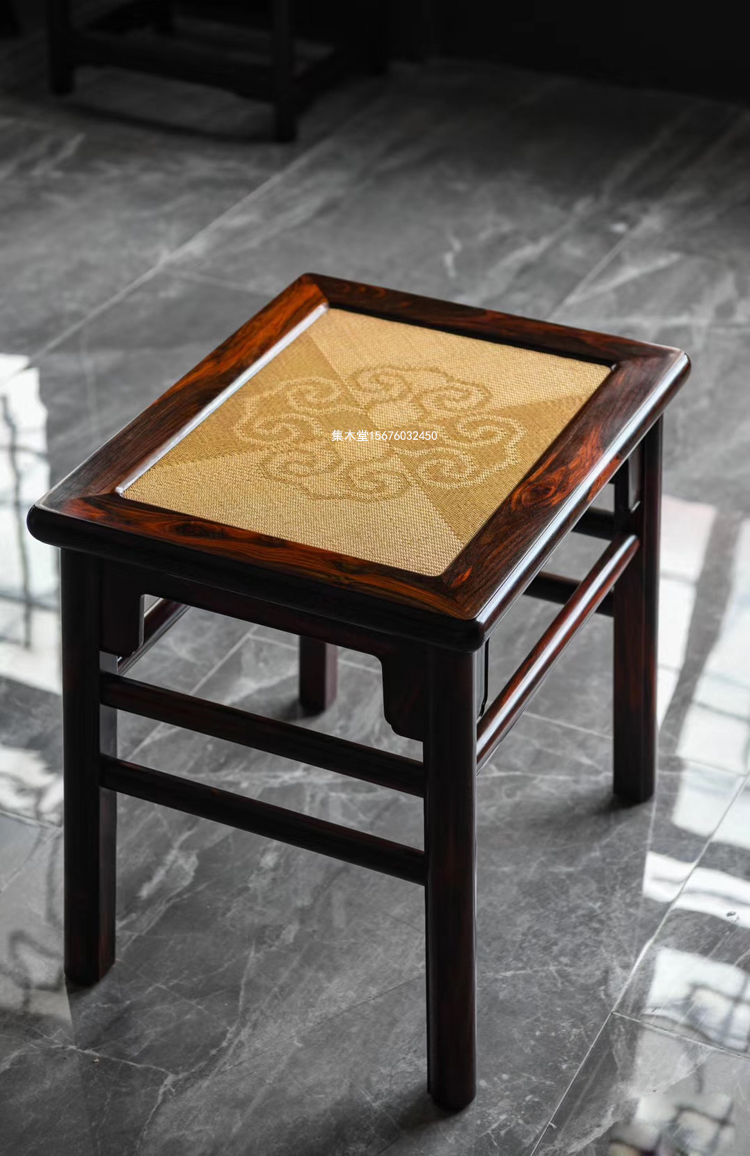 红木家具鉴赏——无束腰直足直枨长方凳,此为圆材,边抹素混面,牙子光素,每面枨子一根,在同一高度上与腿子结合。这是由于腿材粗硕,即使避不开榫眼,也不至于影响其坚实。凳面木板平镶,不落堂,整体结构简练,朴质无文,淳厚耐看。